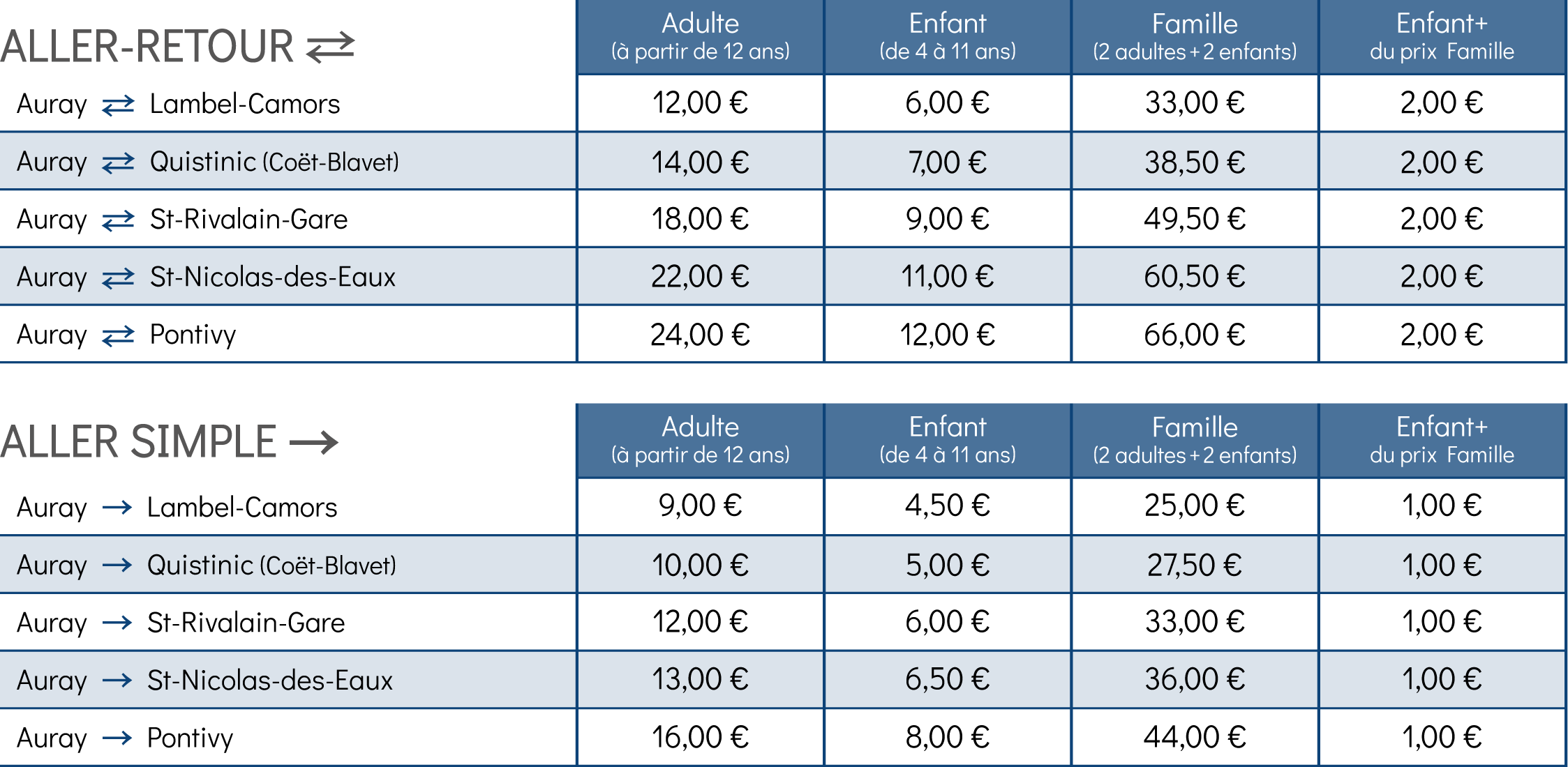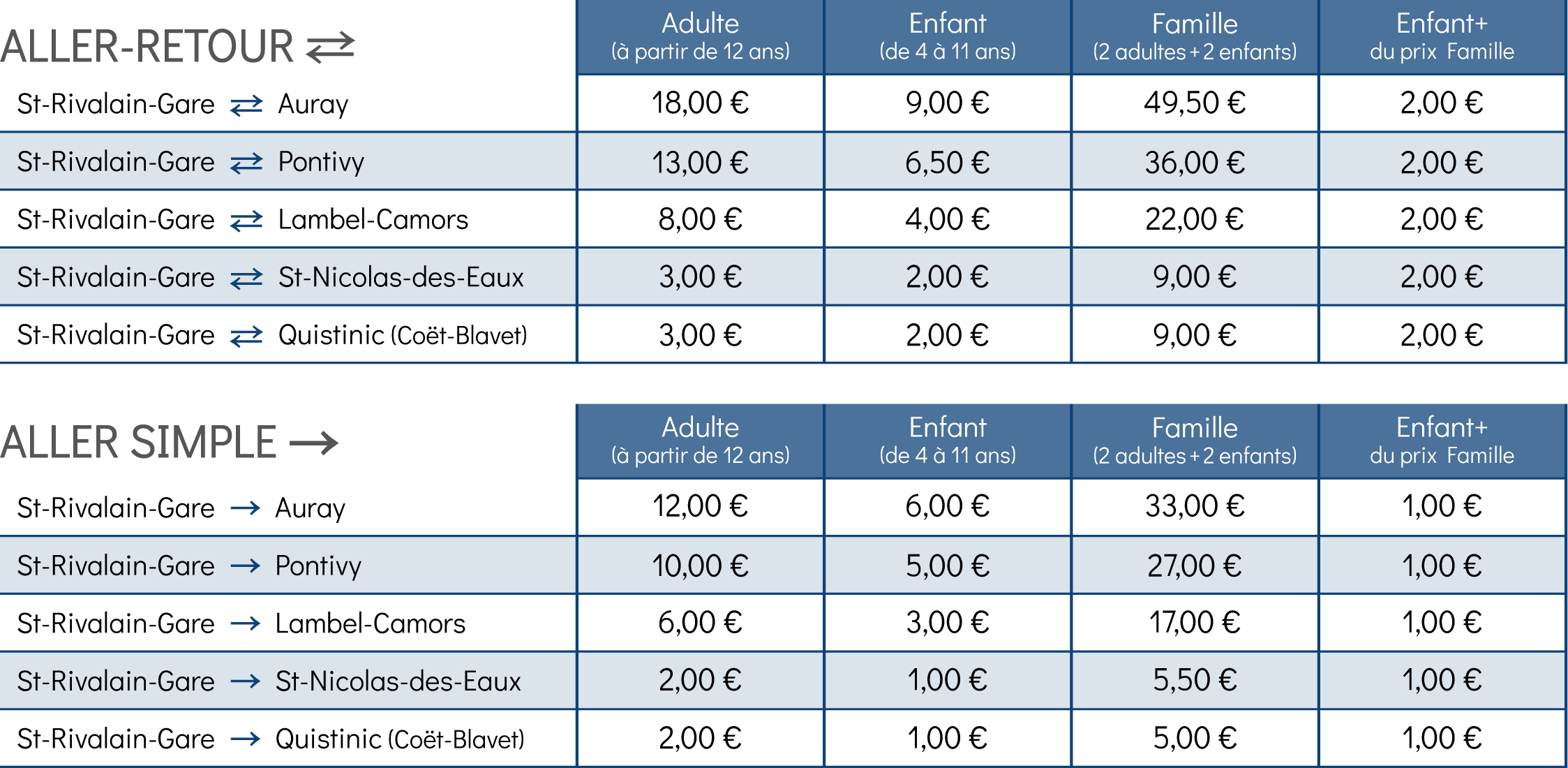 | Aller-retour | Adulte (Ă partir de 12 ans) | Enfant (de 4 Ă 11 ans) | Famille (2 adultes + 2 enfants) | Enfant + (du prix Famille) |