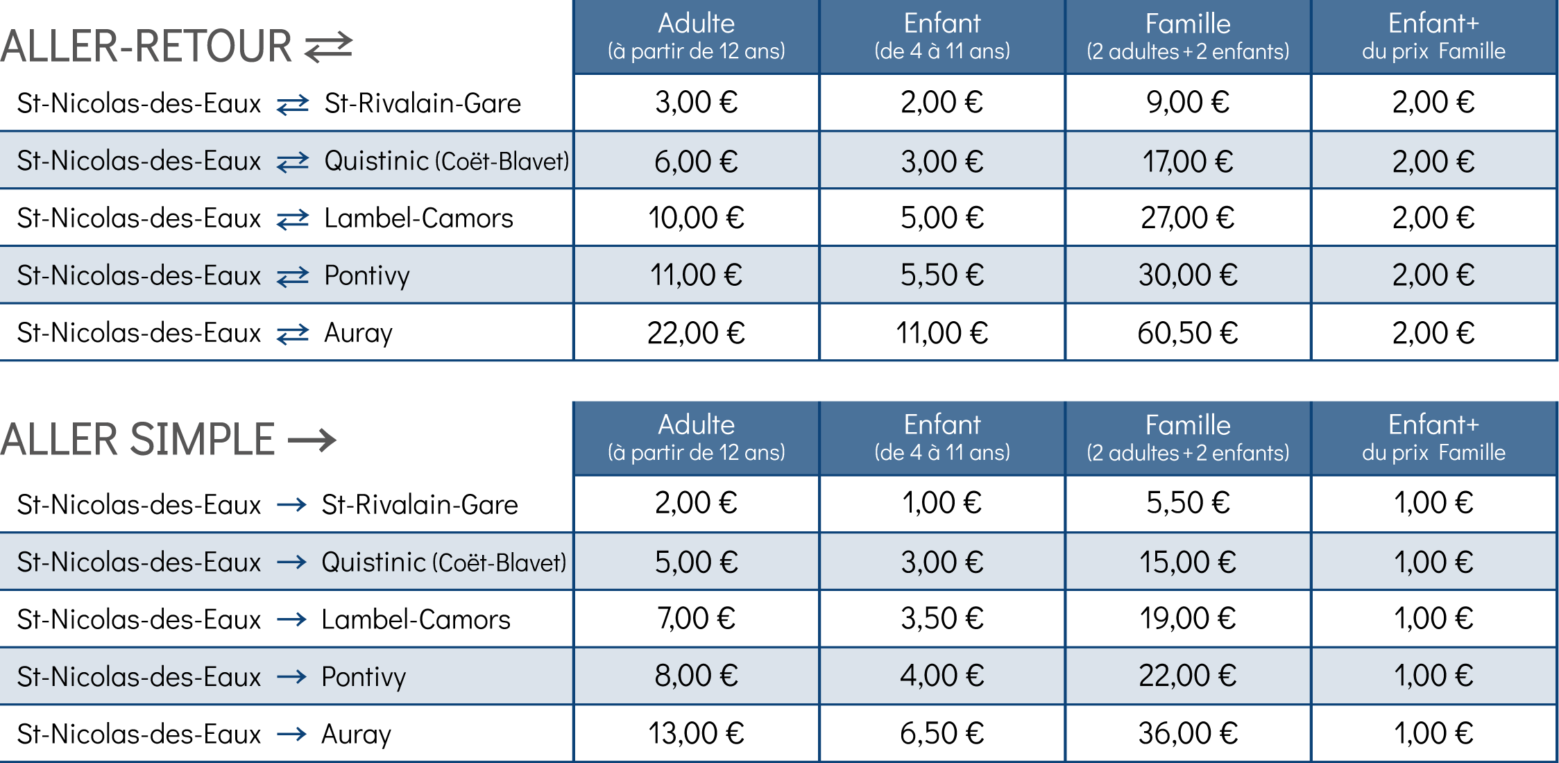 | Aller simple | Adulte (Ă partir de 12 ans) | Enfant (de 4 Ă 11 ans) | Famille (2 adultes + 2 enfants) | Enfant + (du prix Famille) |